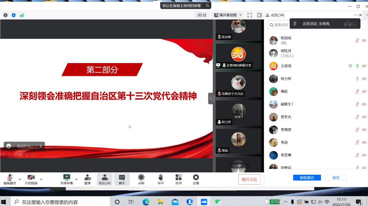 2022年7月26日下午,学院通过腾讯视频会议形式召开《深入学习贯彻自治区第十三次党代会精神》宣讲会,邀请马克思主义学院王思鸿教授主讲。会议由常务副院长何力军同志主持,全体师生参加。