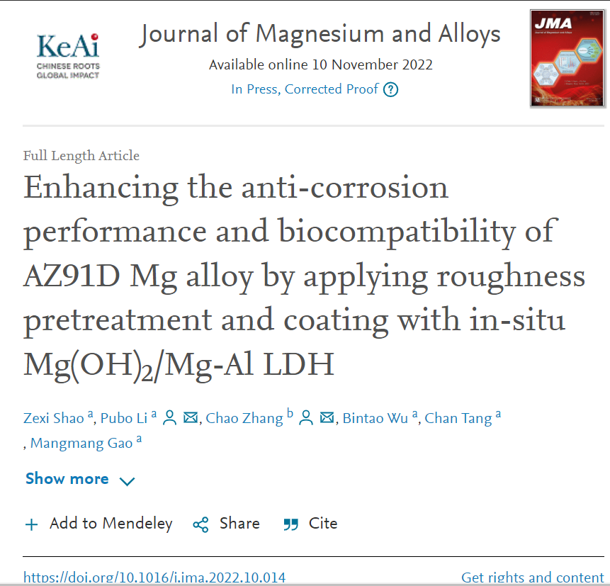 先进工程材料平台李普博副教授、吴斌涛副教授和高忙忙研究员团队在镁合金腐蚀防护和生物相容性能研究领域取得重要进展,工作以“Enhancing the anti-corrosion performance and biocompatibility of AZ91D Mg alloy by applying roughness pretreatment and coating with in-situ Mg(OH)2/Mg-Al LDH”为题发表于镁合金材料国际顶级学术期刊《Journal of Magnesium and Alloys》,影响因子达到11.8。学院2022届硕士研究生邵泽西为第一作者,ebook漫画