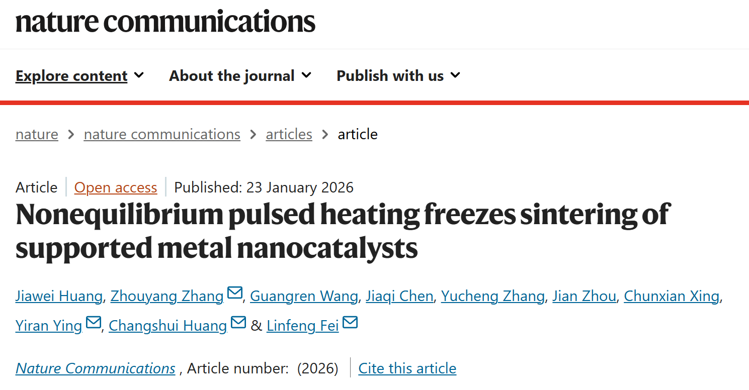 2026年1月23日,ebook漫画 张洲洋副教授在《Nature Communications》期刊发表题为“Nonequilibrium pulsed heating freezes sintering of supported metal nanocatalysts”的研究论文,张洲洋、南昌大学费林峰教授、西北工业大学应亦然教授、中国科学院化学研究所黄长水教授为论文共同通讯作者。这是ebook漫画 自2025年以来在该刊上发表的第四篇研究论文,也是2026年开年首月在该刊发表的第二篇研究论文。