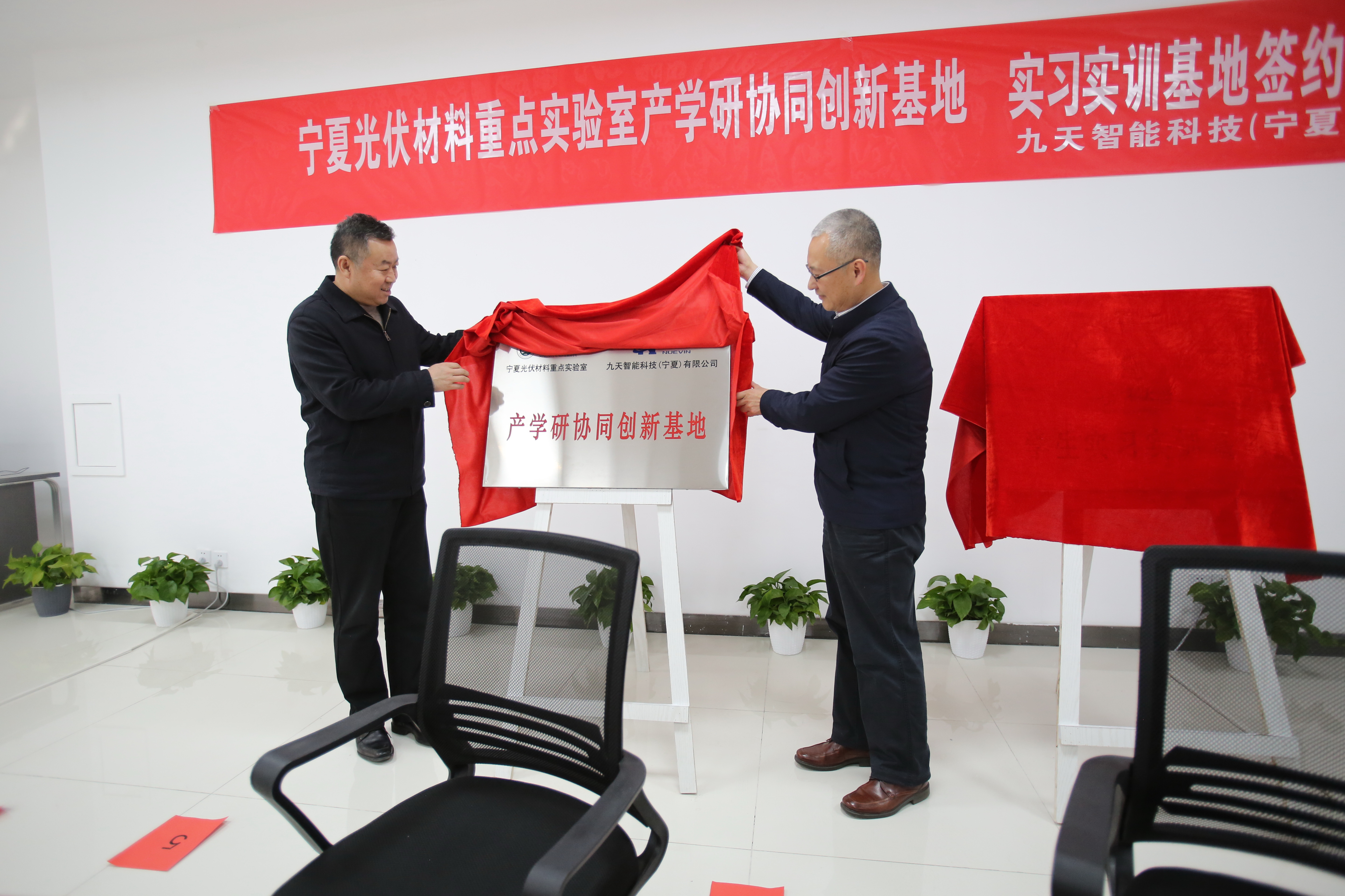 宁夏光伏材料重点实验室与九天智能科技(宁夏)有限公司副总经理刘杨分别代表校企双方在合作协议上签字。李建设、蔡闯共同为产学研协同创新基地揭牌,何力军、苏焕喜共同为学生实习实训基地揭牌。