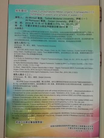 2019年10月16日,应宁夏光伏材料重点实验室邀请,伊朗塔比阿特莫达勒斯大学(Tarbiat Modares University)的Ali Morsali教授和伊朗赞詹大学(Zanjan University)的Ali Ramazani教授在科技楼A610会议室分别作了题为:“Linker functionalized mental-organnic frameworks”、“Synthesis of esters and amides in water”的学术报告。我实验室师生及来自化学化工学院、省部共建煤炭高效利用与绿色化工国家重点实验室的部分师生参加。报告会由刘宽冠博士主持。