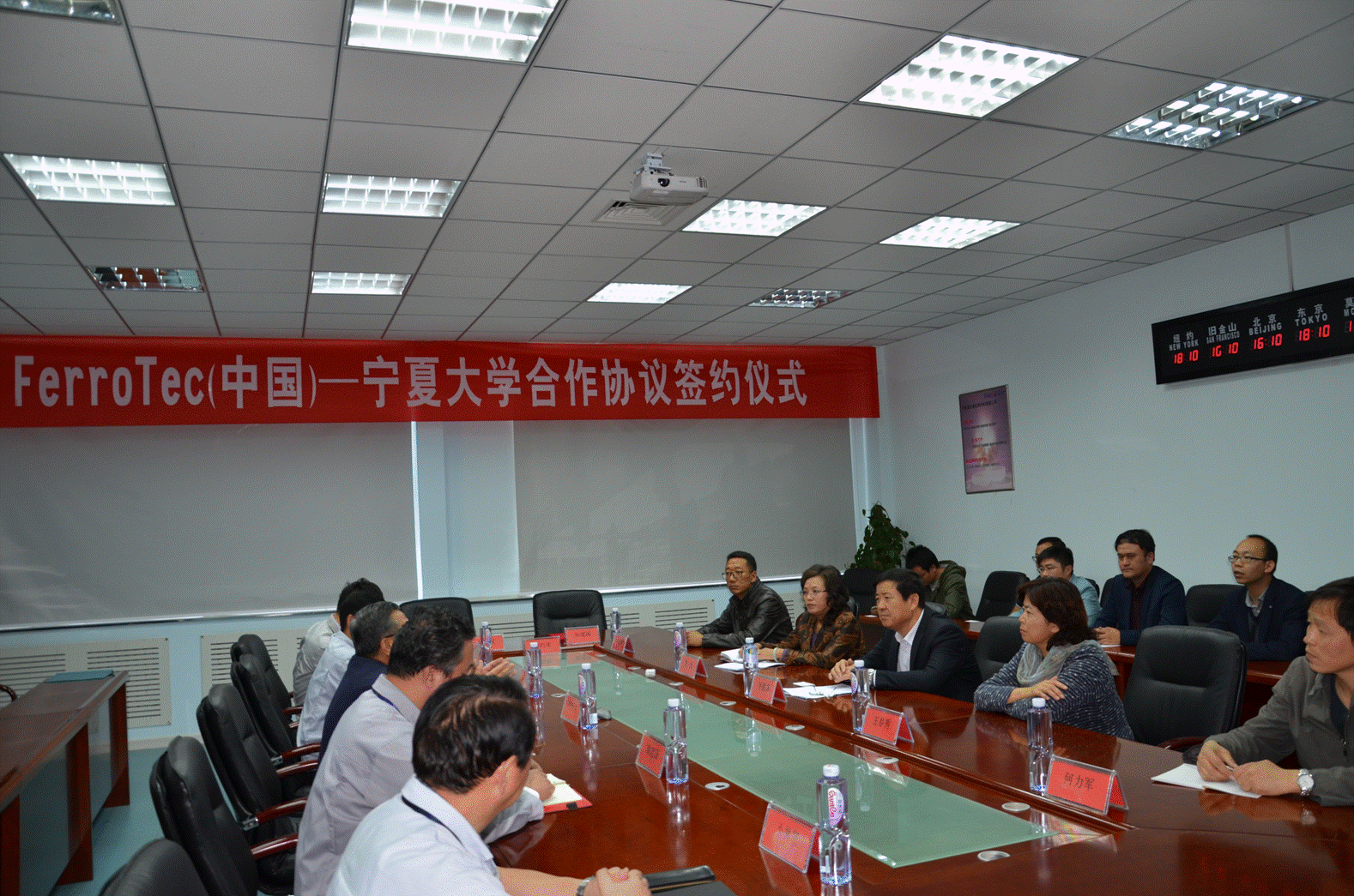 与Ferrotec(中国)合作协议。王春秀副校长、宁夏银和新能源科技有限公司总经理浩育洲参加了签字仪式。出席仪式的还有宁夏光伏材料重点实验室主任李进、副主任何力军、实验室科研骨干及企业方主要部门负责人等。