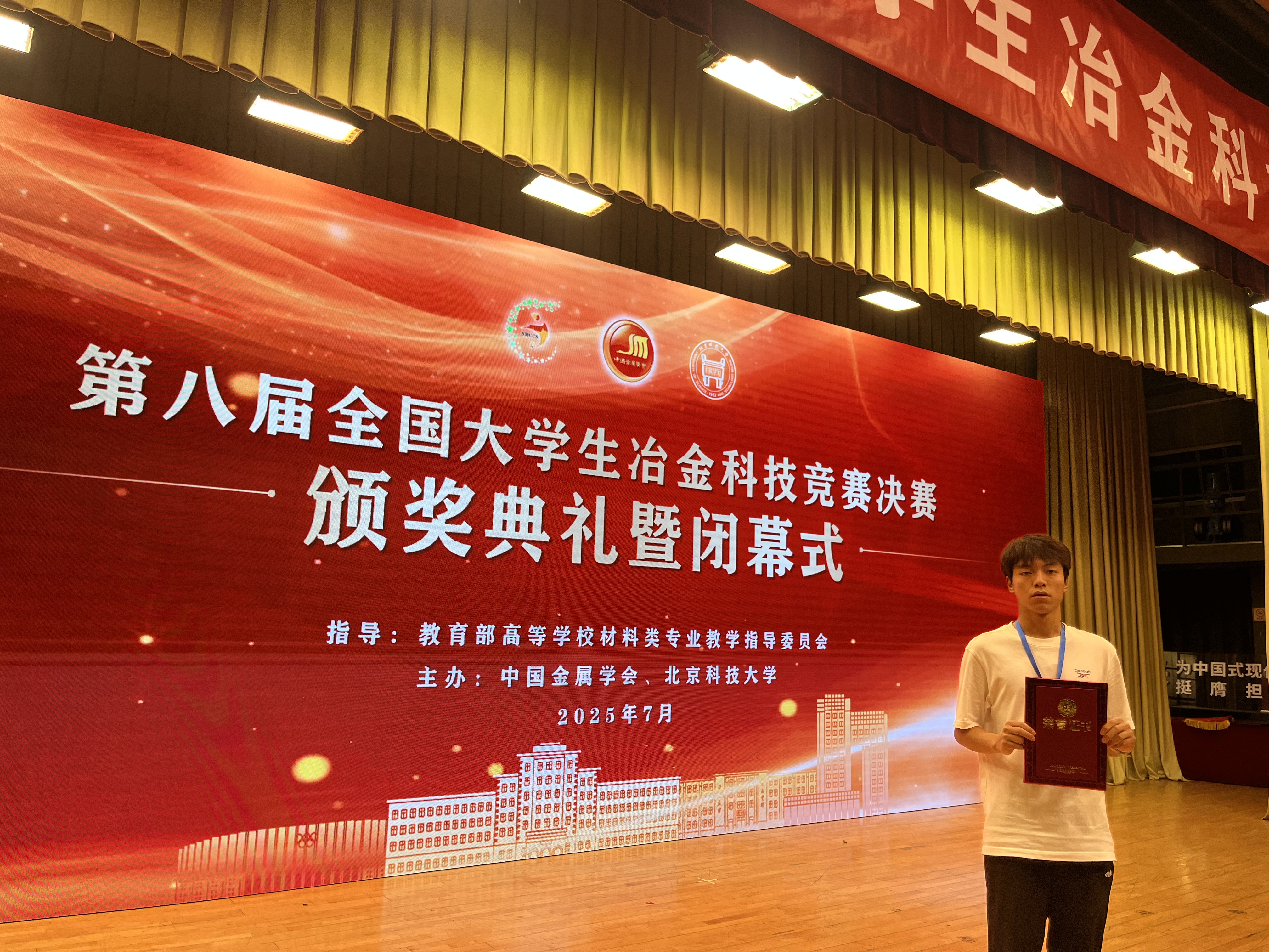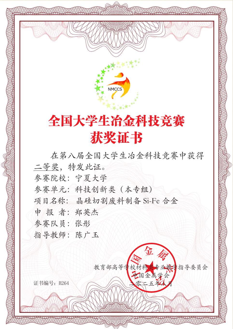 2023级材料科学与工程专业郑英杰同学、2023级新能源材料与器件专业张彤同学组成的参赛队伍凭借作品《晶硅切割废料制备Si-Fe合金》荣获第八届全国大学生冶金科技竞赛二等奖。本次参赛项目由ebook漫画
