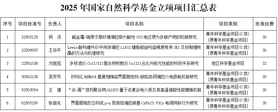 近日,国家自然科学基金委员会公布了2025年度国家自然科学基金集中接收申请项目评审结果。学院共有6个项目成功获批资助,其中青年科学基金项目(C类)5项,地区科学基金项目1项。