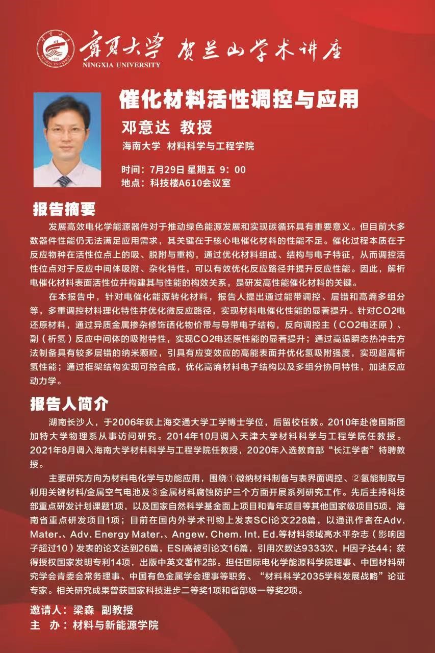2022年7月29日上午,应学院邀请,海南大学材料科学与工程学院邓意达教授在贺兰山校区科技楼A610会议室作了题为“催化材料活性调控与应用”的学术报告。报告会由副院长李海波同志主持,学院全体师生,及化学与化工学院、物理与电气工程学院等相关领域的师生聆听了报告。