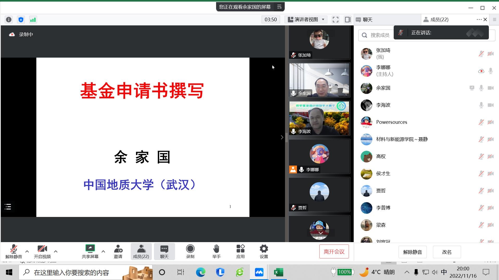 2022年11月16日晚上,学院通过线上会议形式举办了“基金周周讲”第六期报告。报告由李海波副院长主持,中国地质大学(武汉)余家国教授主讲,学院全体教师参加。
