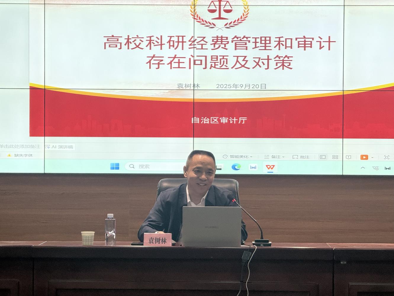 为贯彻落实学校重大项目设备采购领域廉政谈话会精神,增强学院科研人员诚信意识,筑牢科研项目廉洁防线, 9月20日,学院特邀自治区审计厅袁树林处长来院作科研项目管理专题报告。报告由院长夏明许主持,学院领导班子及全体教师聆听报告。