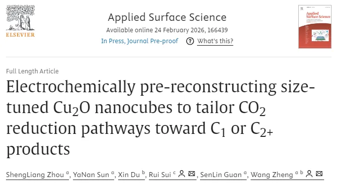 王政教授团队在《Applied Surface Science》期刊发表题为“Electrochemically pre-reconstructing size-tunedCu2O nanocubes to tailor CO2reduction pathways toward C1or C2+products”的研究论文,23级硕士研究生周生亮为论文第一作者。